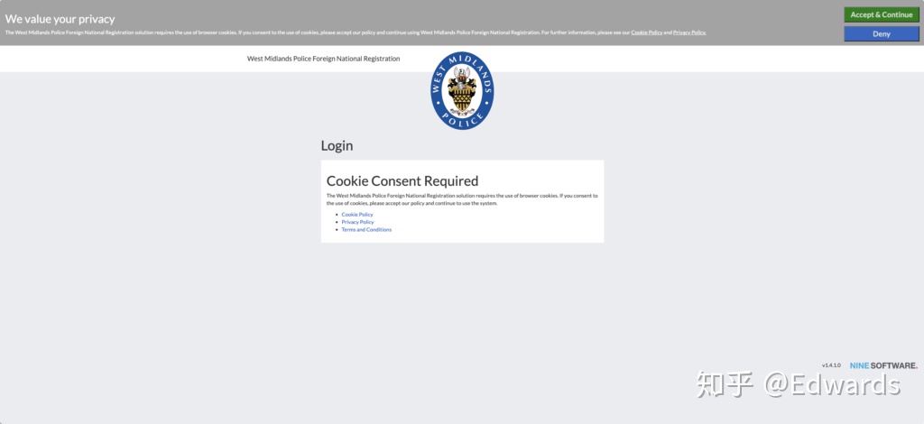 - 访问警局注册网站 https://west-midlands.overseasregistrations.uk/ (opens new window),选择 Accept & Continue 。(否则无法进行下一步)