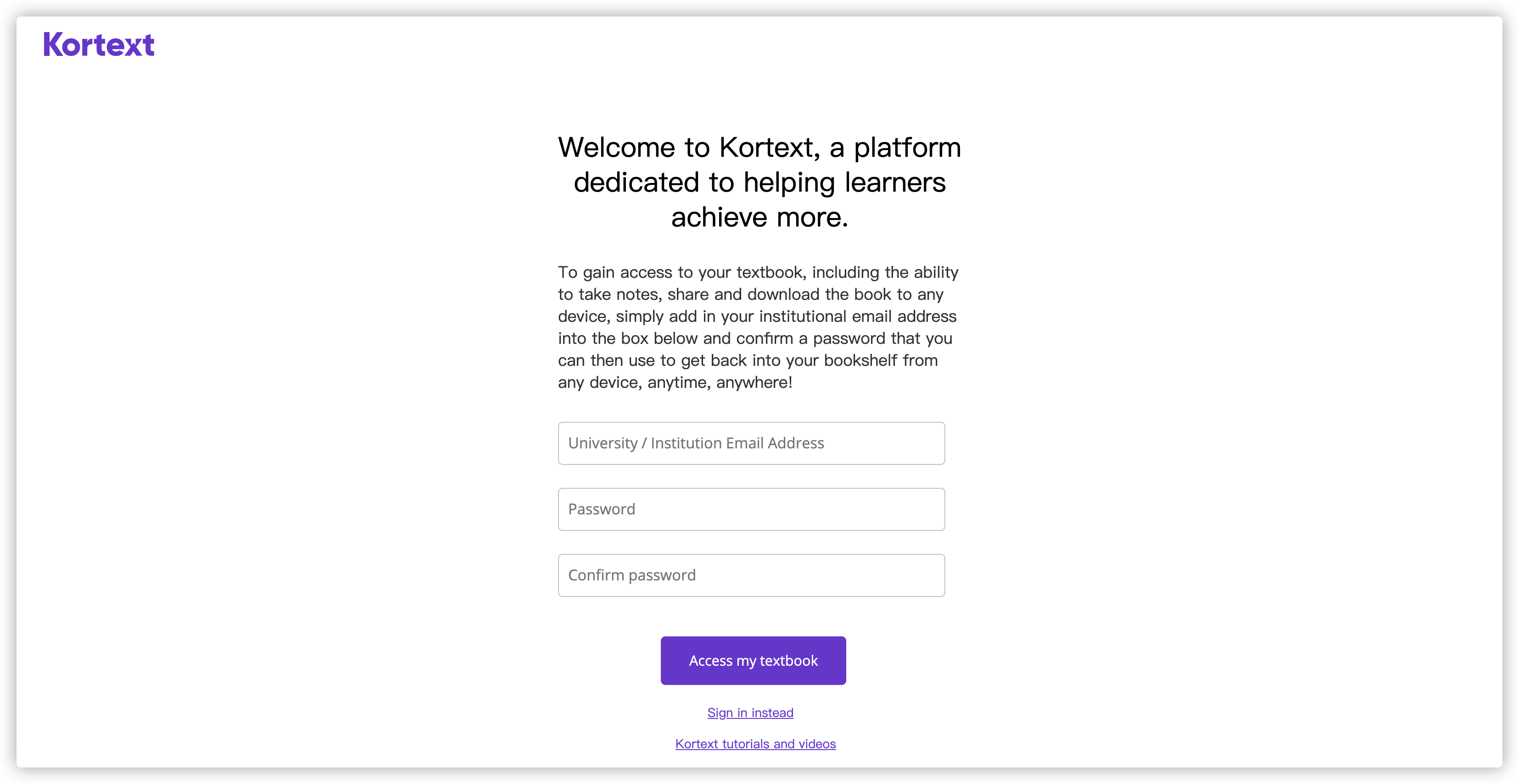 跳转至此界面(第一次认证时),输入学校邮箱及设置密码,后点击 Access my textbook ,如果你已经注册,请使用 Sign in instead